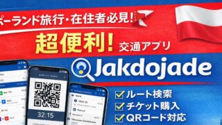 ポーランド旅行・在住者必須アプリ「Jakdojade」の使い方を徹底解説。ルート検索・チケット購入・QRコード表示まで画像付きでわかりやすく紹介。ワルシャワ空港から市内移動もこれ1つで安心!